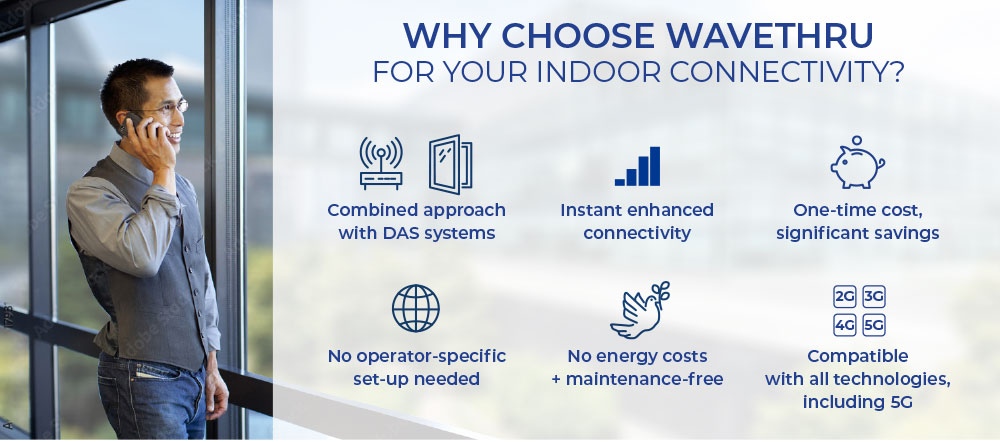 In conclusion, WAVETHRU compliments DAS to deliver added value and enable especially effective combinations. It provides customized solutions that meet specific building requirements, such as cost-effective indoor coverage, or specialized connectivity needs. It also compliments building design, delivers connectivity where it is really needed, optimizes costs, enables scalability, and future-proofs operations, allowing buildings to adapt to evolving connectivity standards and user expectations over time.